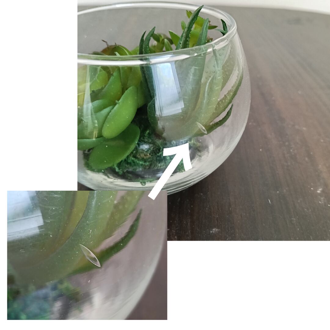 こちらは、ガラスのフチにわずかな凹凸(ボコボコしている箇所)が見られるのと、フチに気泡があるため、