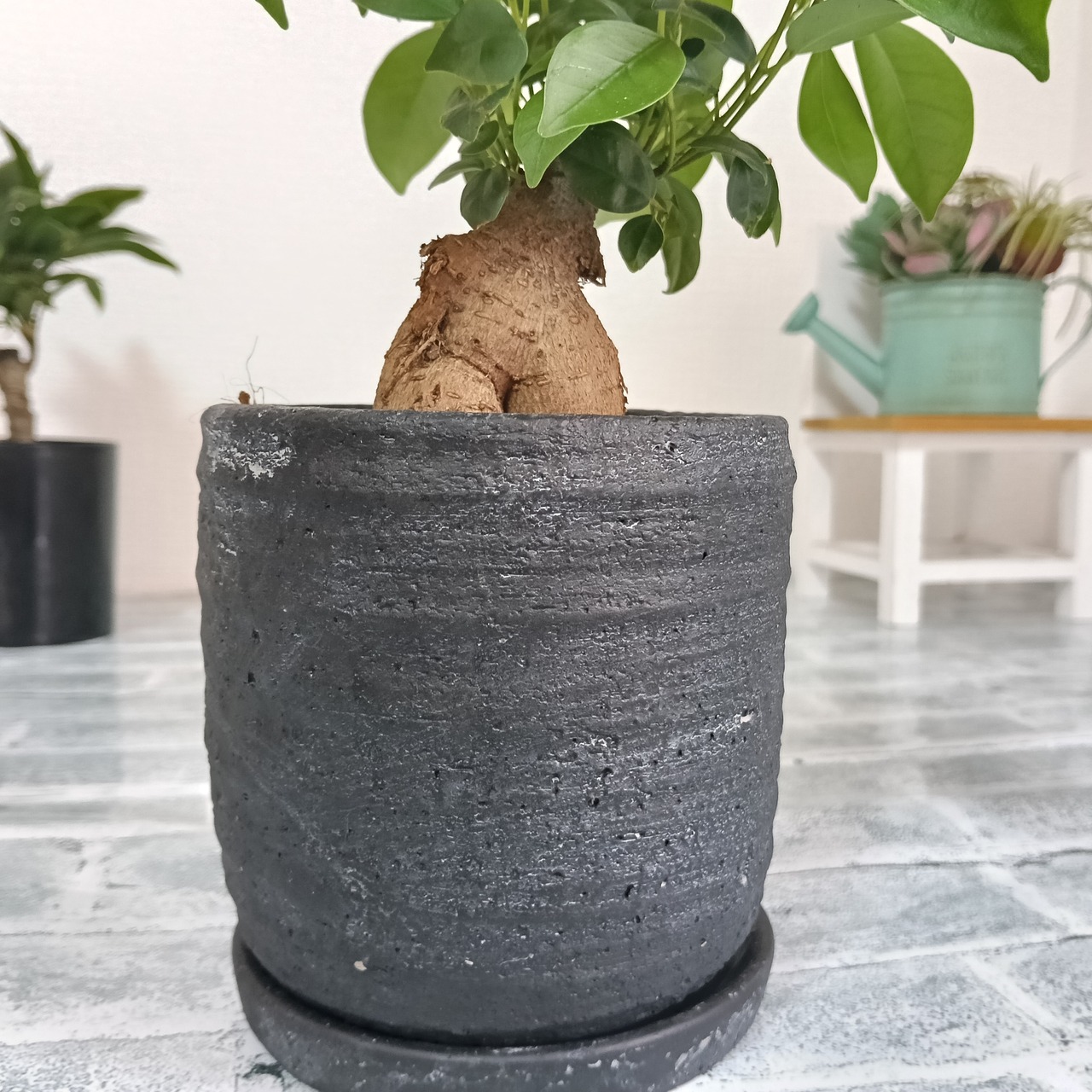 重厚な利休陶器鉢と、愛らしいガジュマルの組み合わせ。