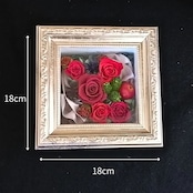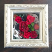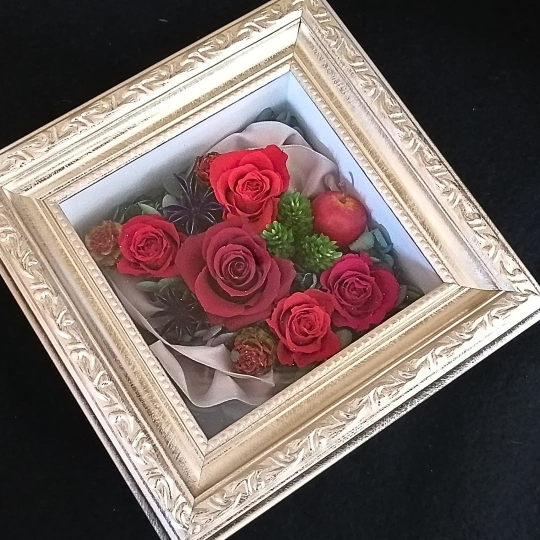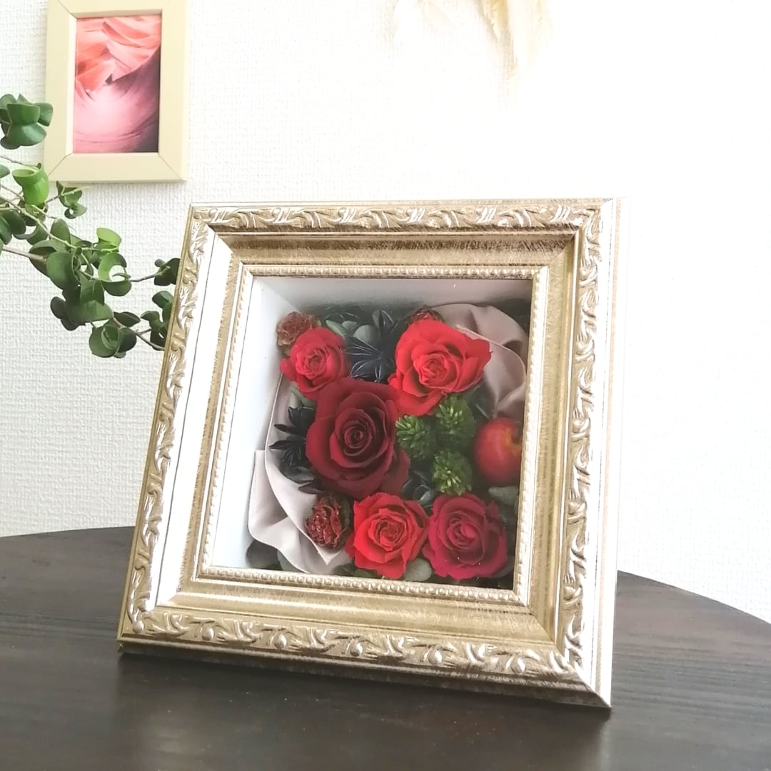 ■ロココ調の優雅で華やかな装飾が施されたゴールドのフレームに、シックな赤バラのプリザーブドフラワーを入れてアレンジしました。