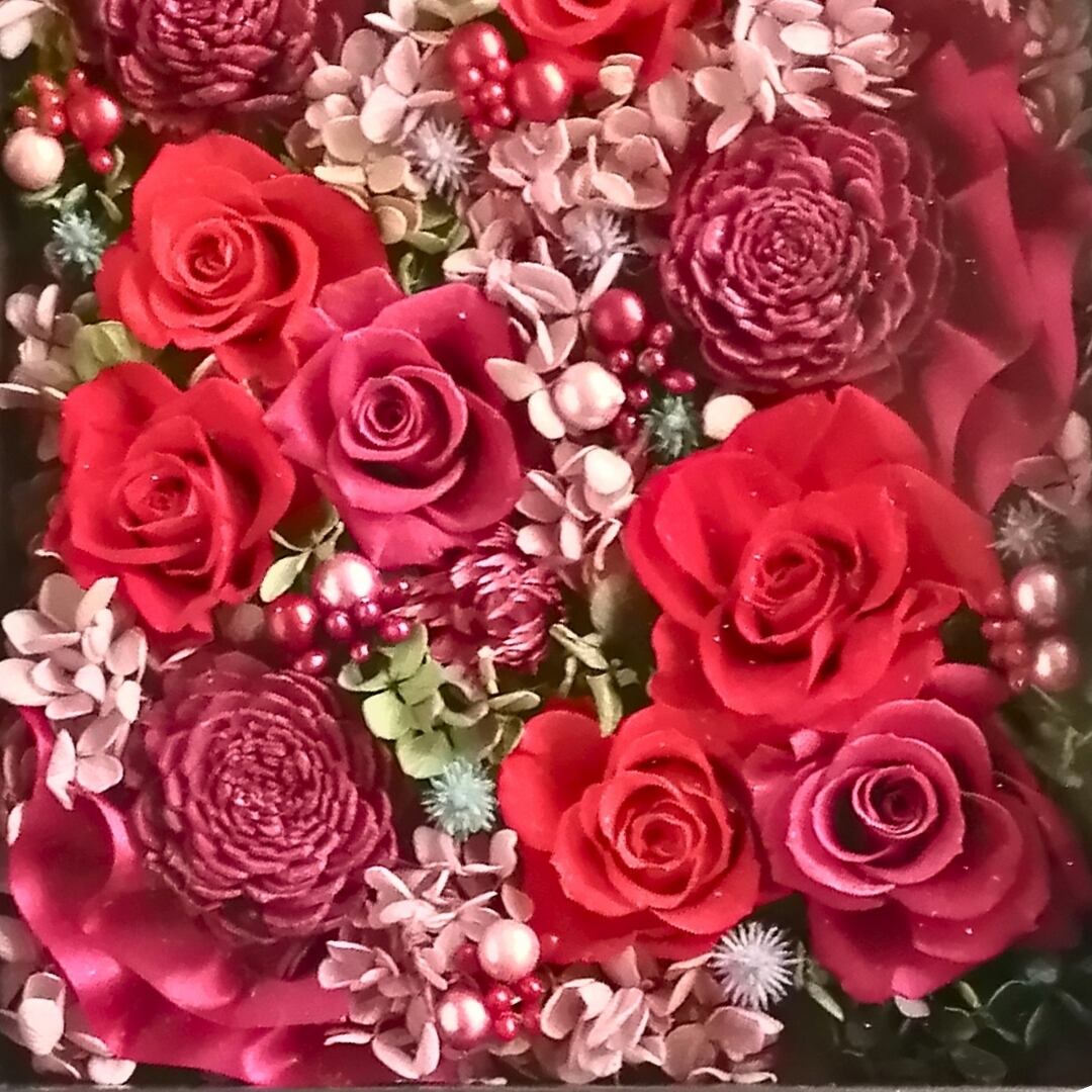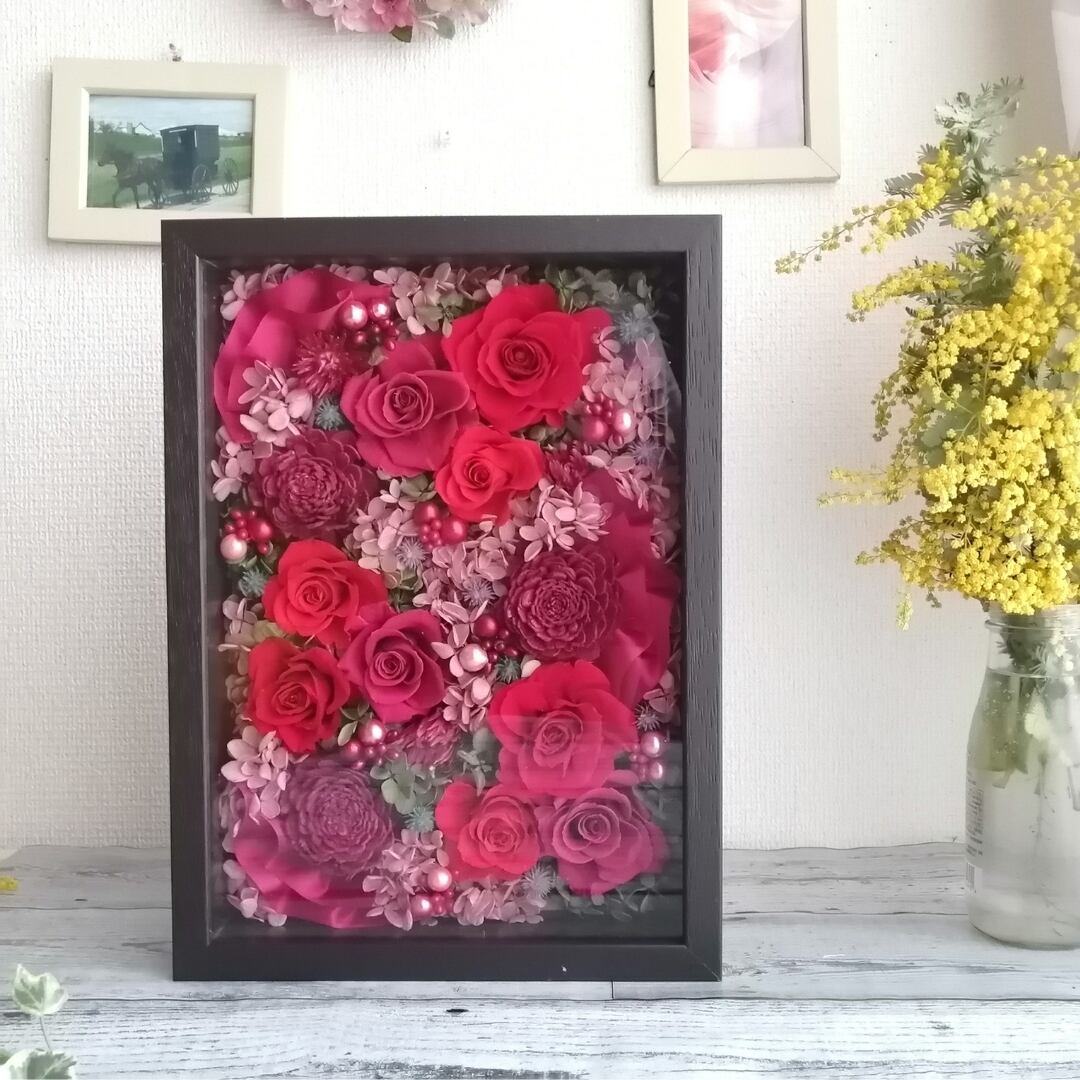 ■A4サイズの特大フレームに、赤とピンクのお花を隙間なく敷き詰めた贅沢なアレンジ。