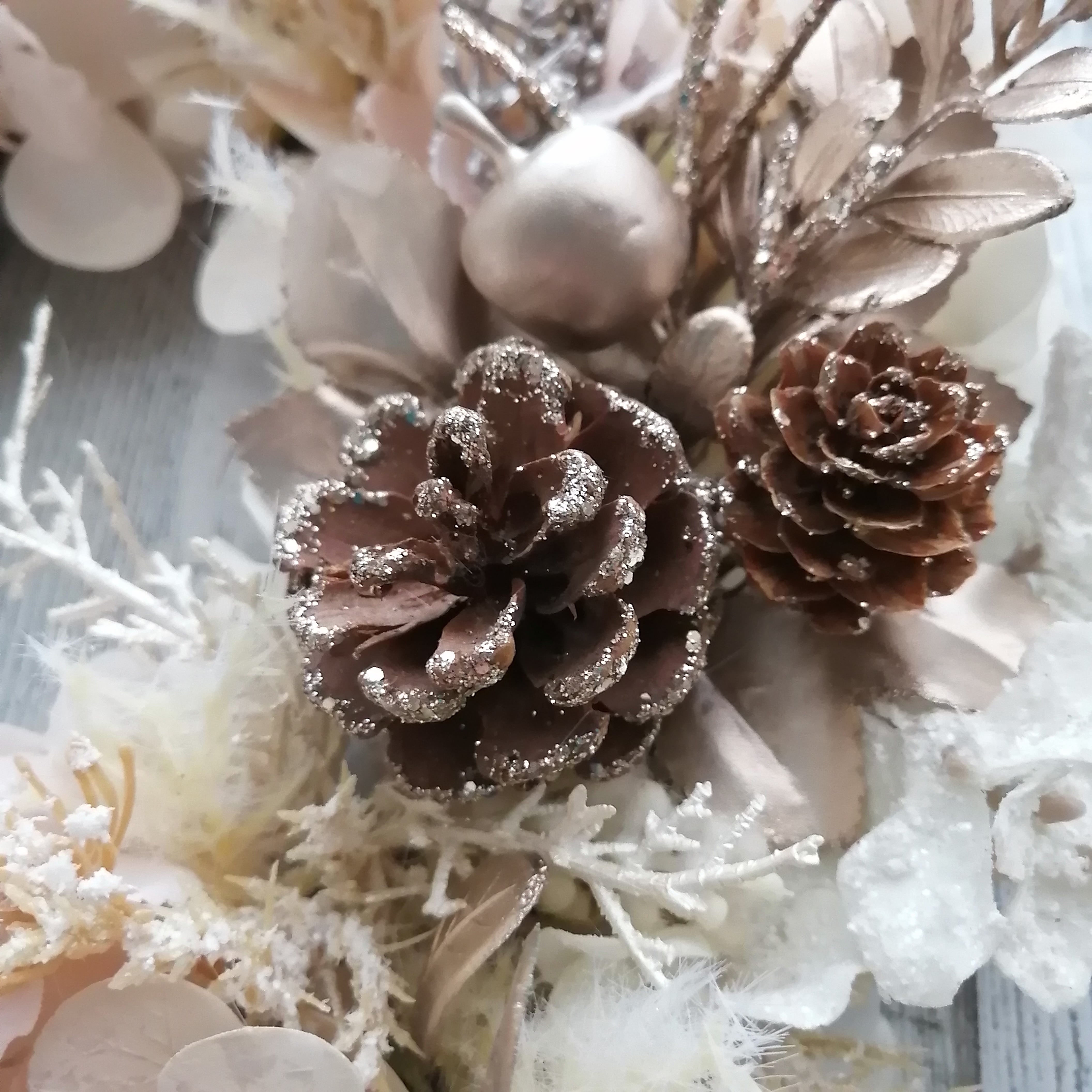 ホワイトクリスマスをイメージして、真っ白なお花や木の実に淡いピンクをあわせて作りました。高級感あふれるリースになっています♪