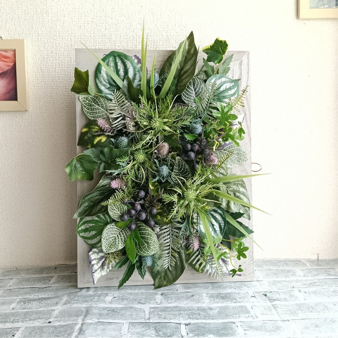 特大のフレームに、たっぷりとグリーンを寄植えした壁掛けフェイクグリーン(ウォールグリーン)です。