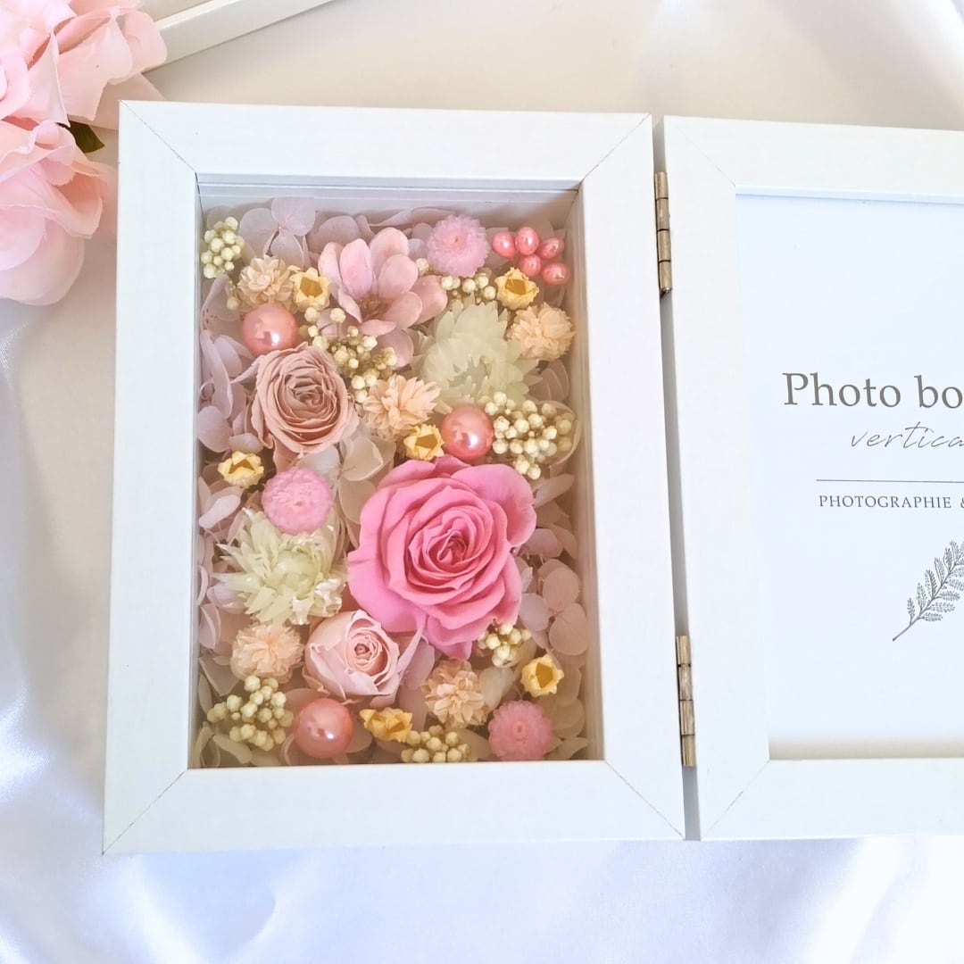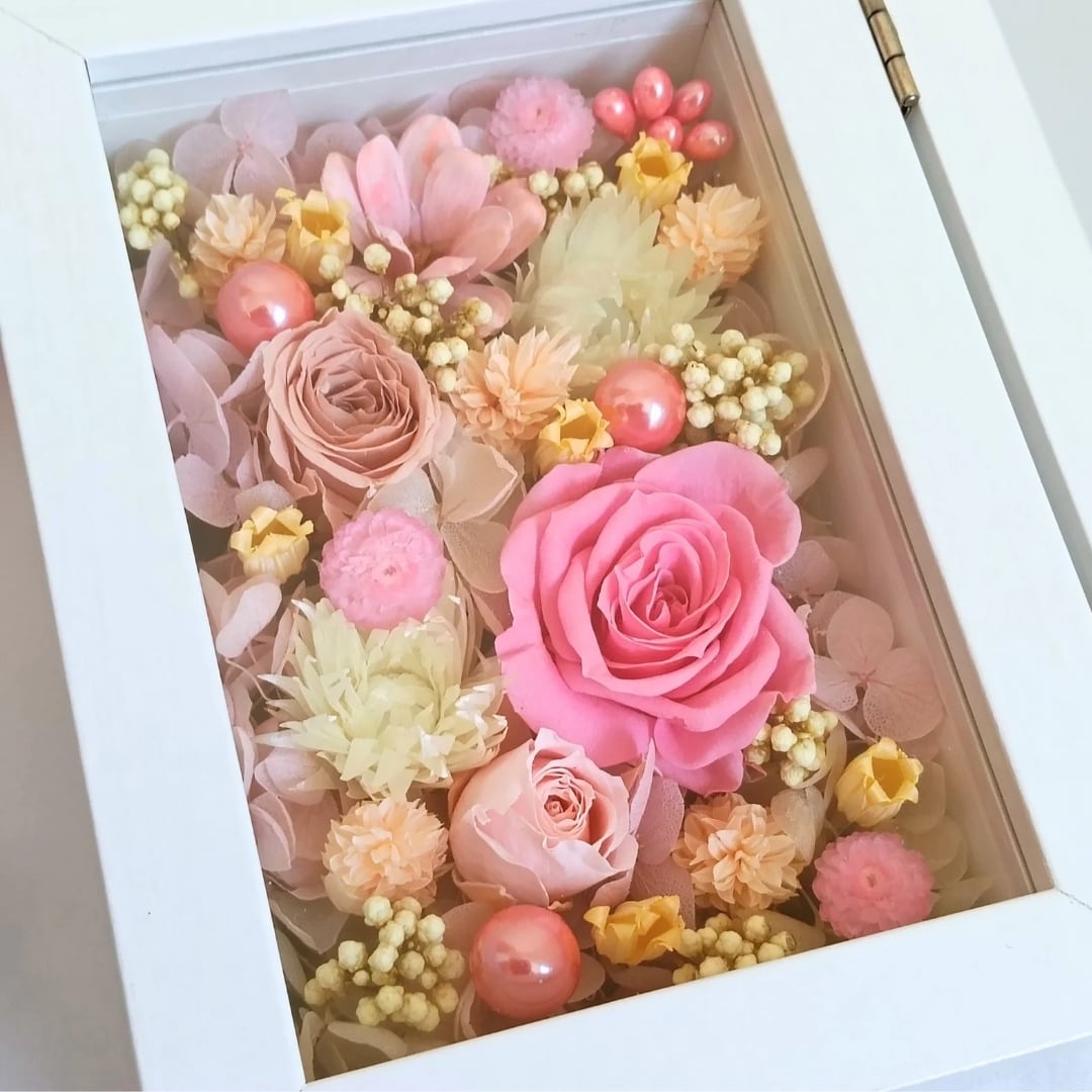 ■今回は真っ白なフォトフレームに、ピンクや黄色のお花をたっぷり入れて、春らしい、あたたかみのあるデザインに仕上げました♪
